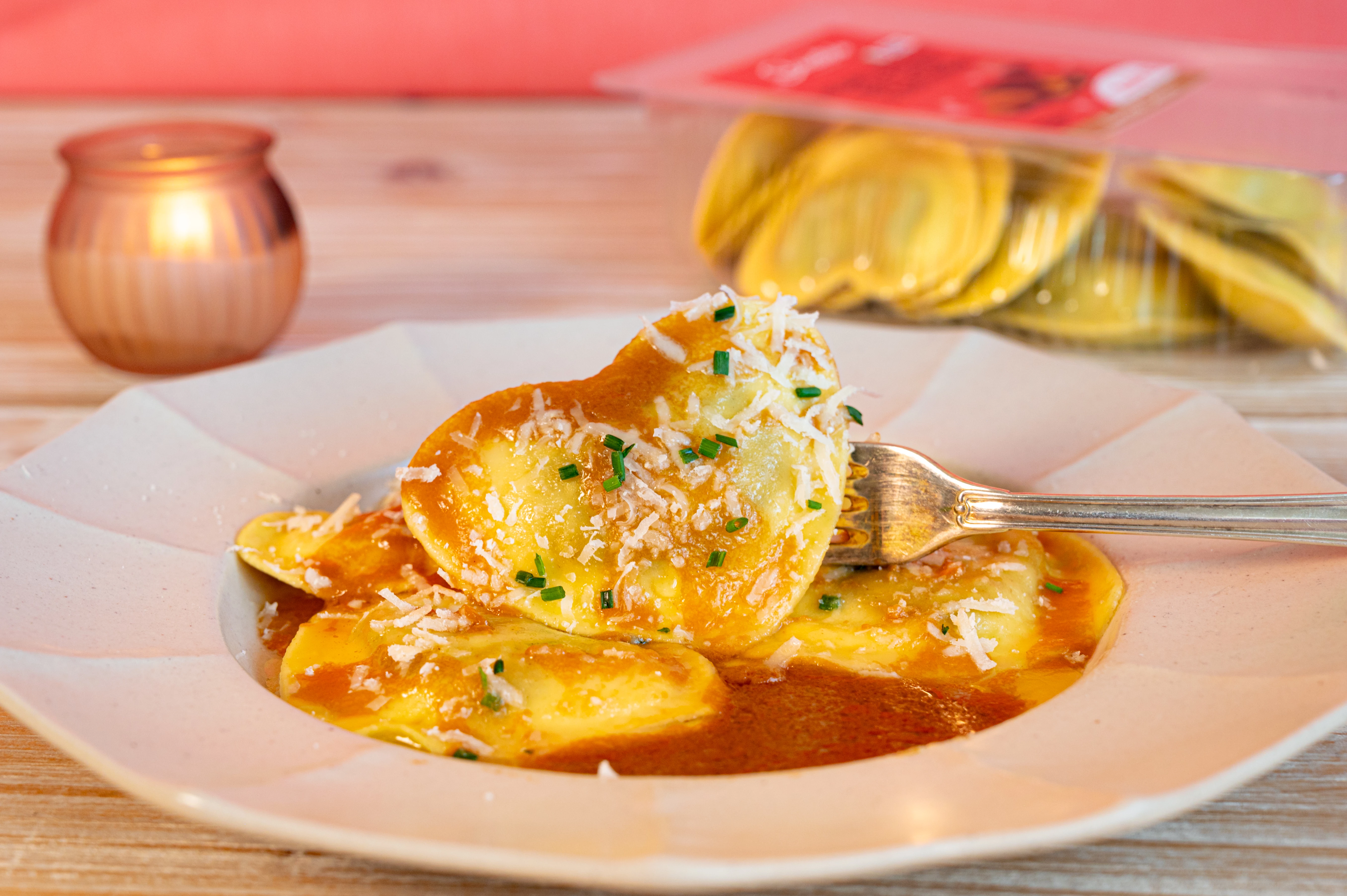L’idea nasce dal desiderio di esplorare il mondo della pasta fresca in chiave dessert: un raviolo dal profilo dolce, con un ripieno capace di richiamare l’esperienza del soufflé, cremoso e avvolgente, che si scioglie in fase di cottura offrendo un risultato sorprendente e ancora poco esplorato nella categoria. Una proposta pensata per stupire il mercato di riferimento e ampliare le occasioni di consumo.