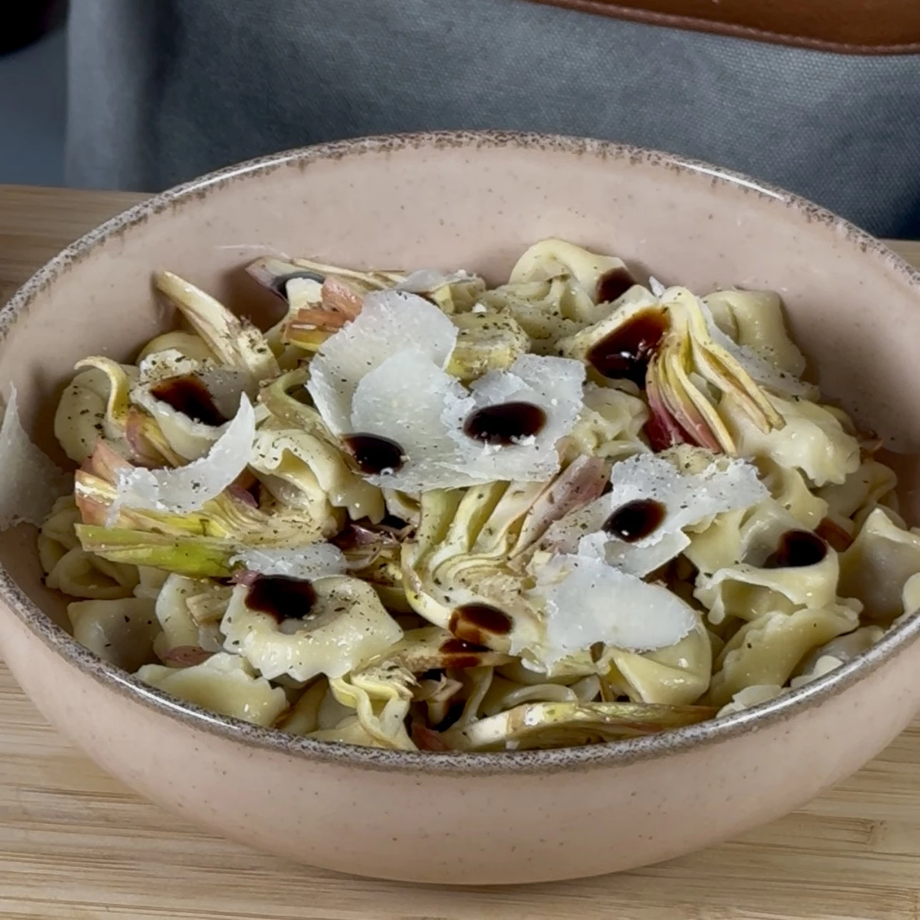 Unisci i cappelletti all’insalata di carciofi e lascia riposare per qualche minuto, così che si raffreddino e i sapori si amalgamino. Impiatta e completa con una macinata di pepe, ulteriori scaglie di Grana e qualche goccia di glassa di aceto balsamico.