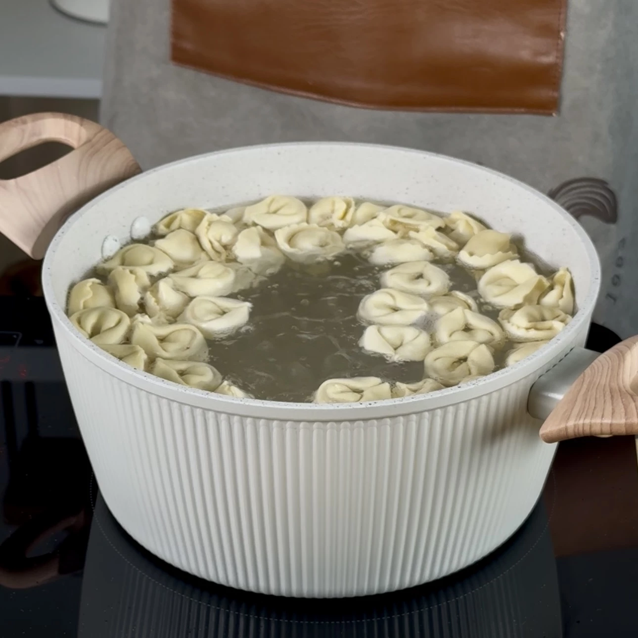 Porta a bollore una pentola di acqua salata e cuoci i Cappelletti al Prosciutto Crudo per 3 minuti. Scolali con una schiumarola e trasferiscili in una ciotola e condiscili con un filo d’olio.
