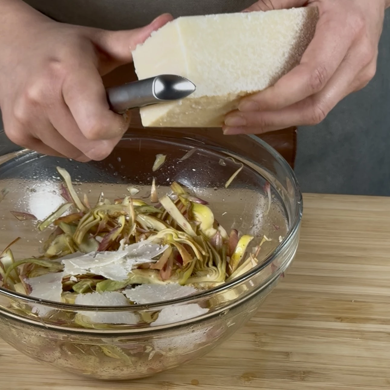 Dopo aver fatto riposare i carciofi per qualche minuto nell’acqua, scolali bene e trasferiscili in una ciotola. Condiscili con la citronette e mescola delicatamente, aggiungendo anche alcune scaglie di Grana per completare l’insalata.