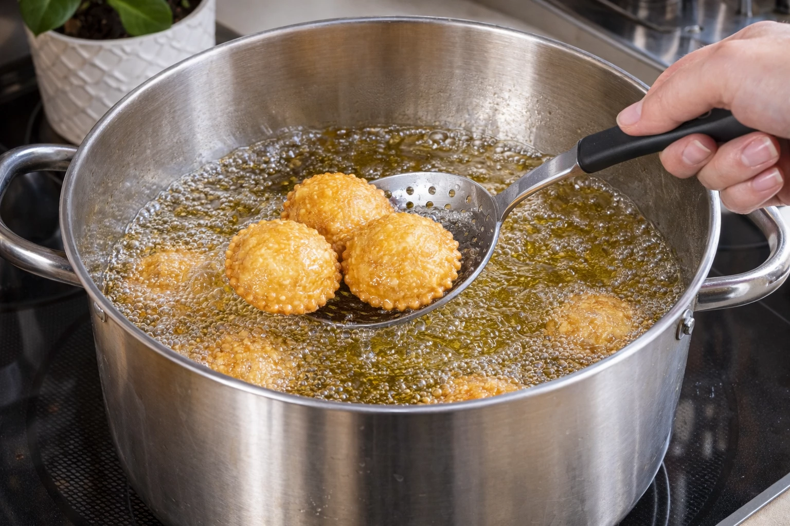 Versa l’olio di girasole in una pentola capiente dai bordi alti e portalo a temperatura. Quando è ben caldo, immergi pochi Ravioli alla volta per evitare di abbassare la temperatura dell’olio. Friggili finché risultano dorati e croccanti in superficie.