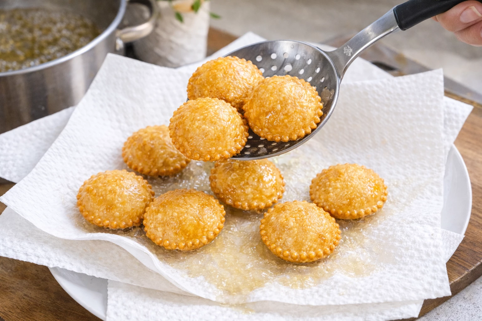 Preleva i ravioli con una schiumarola e adagiali su carta assorbente per eliminare l’olio in eccesso, mantenendoli ben caldi.