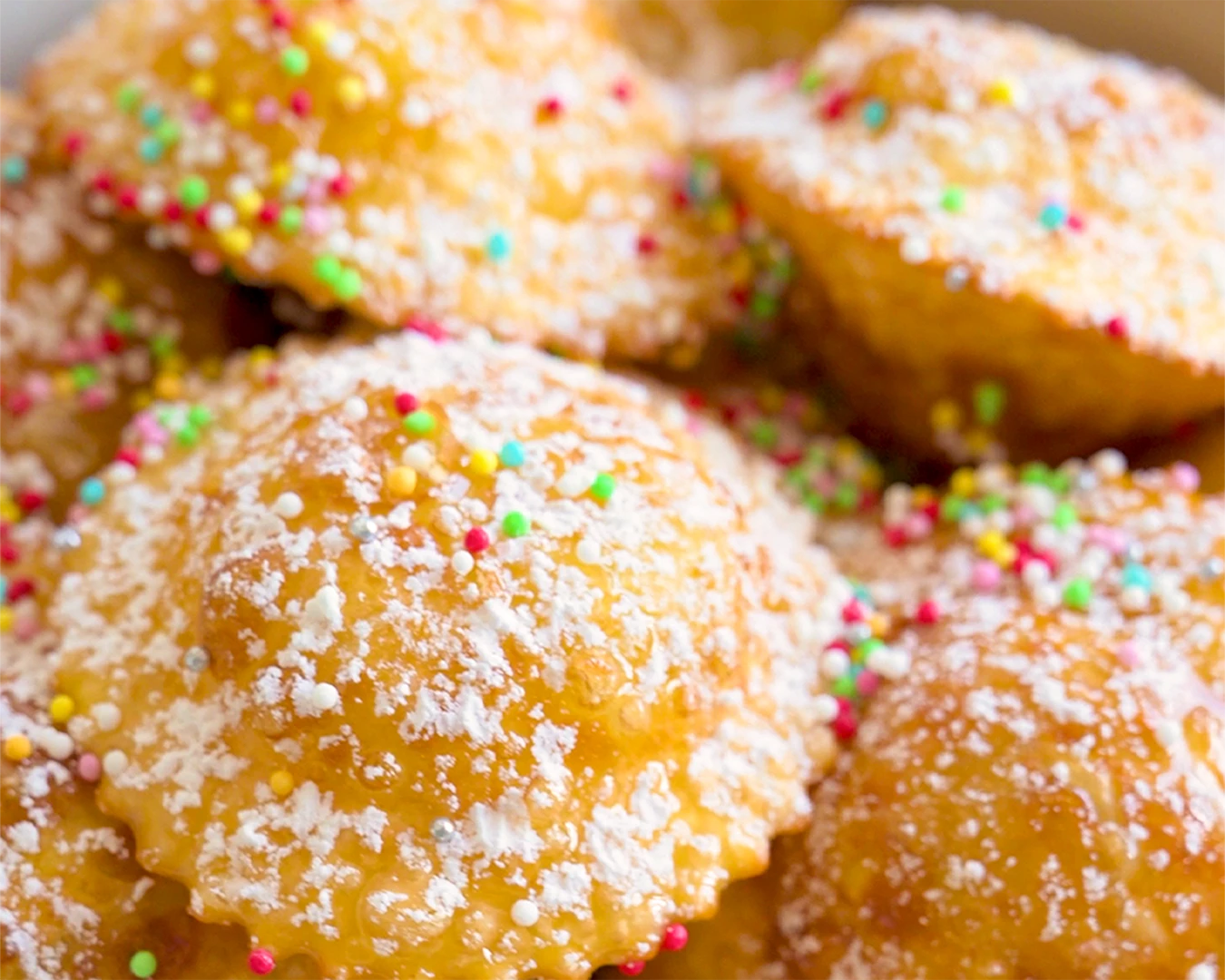 Disponi i ravioli fritti su un piatto da portata. Irrorali con miele a filo, spolvera con zucchero a velo e completa con una manciata di zuccherini colorati per un tocco vivace e goloso. Servili ancora caldi… e il piatto si svuoterà in un attimo.